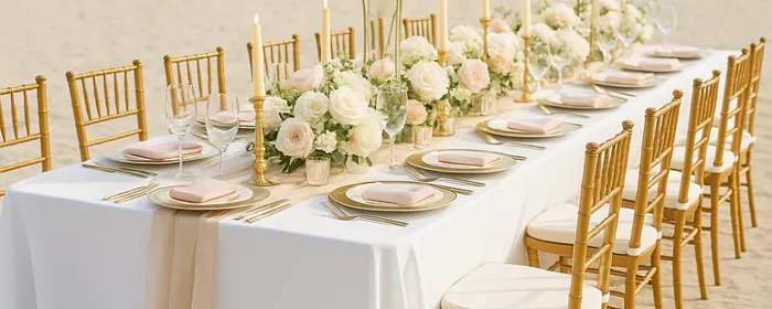 - Modern Glam: Gold chairs with mirrored tables and crystal centerpieces.